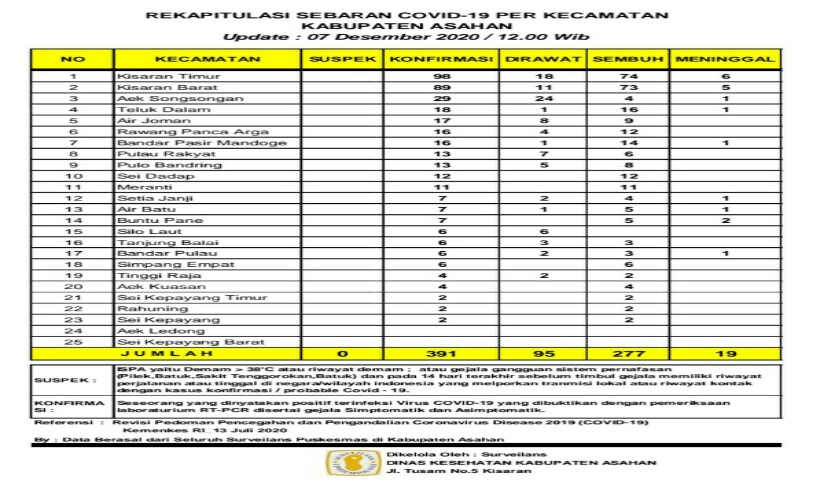 Demikian Data Update tersebut disampaikan Juru Bicara Gugus Tugas Percepatan Penanganan Covid – 19 Kabupaten Asahan H. Rahmat Hidayat Siregar S. Sos. M.Si, berdasarkan hasil data surveilans dari seluruh Puskesmas yang ada di wilayah Kabupaten Asahan sebagaimana di kelola Dinas Kesehatan Kabupaten Asahan. Senin (07/12/2020).