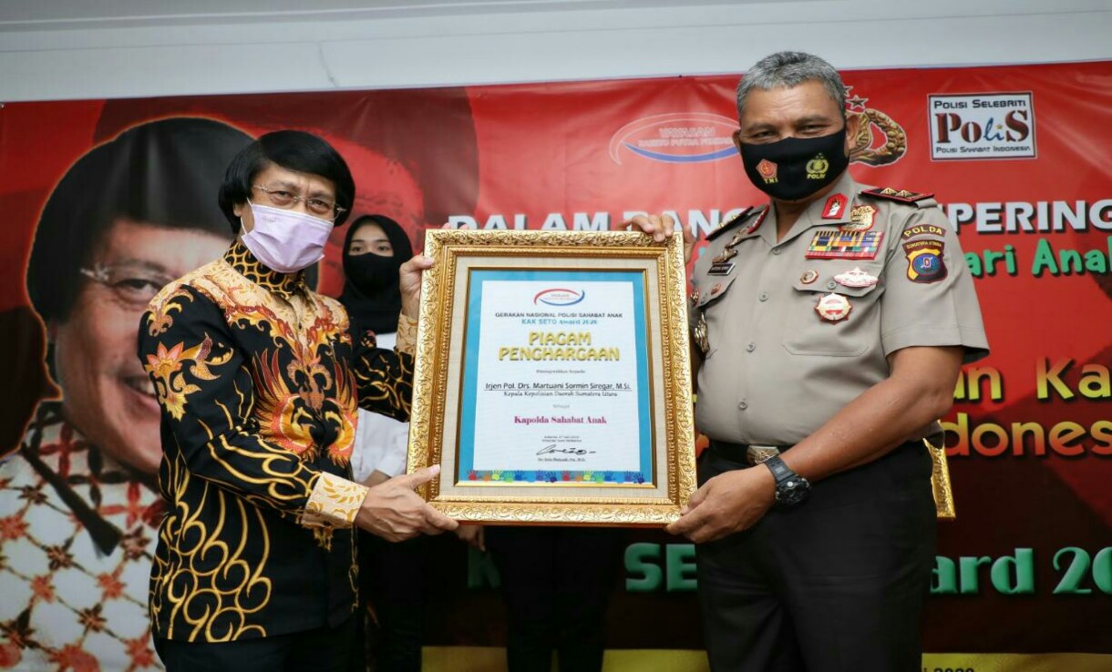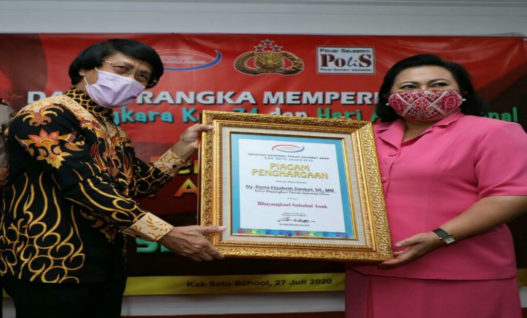 tobapos.co – Kapolda Sumut Irjen Pol Drs. Martuani Sormin, M.Si dan Ketua Bhayangkari Daerah Sumut Ny Risma Martuani Sormin menerima penghargaan Kak Seto Award 2020 berikut Rekor MURI.