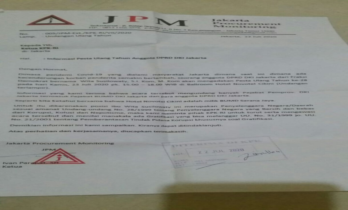 “Karena legislatif termasuk penyelenggara negara maka JPM Jakarta sudah membuat surat ke KPK sesuai UU. No.28/1999 tentang Penyelenggara Negara yang Bersih dan Bebas dari KKN serta pasal 12B UU. No. 31/1999 jo. UU. No. 20/2001 tentang gratifikasi. Kami minta KPK turut serta hadir dan melakukan pengawasan di acara tersebut untuk menghindari gratifikasi,” papar Ivan Parapat.