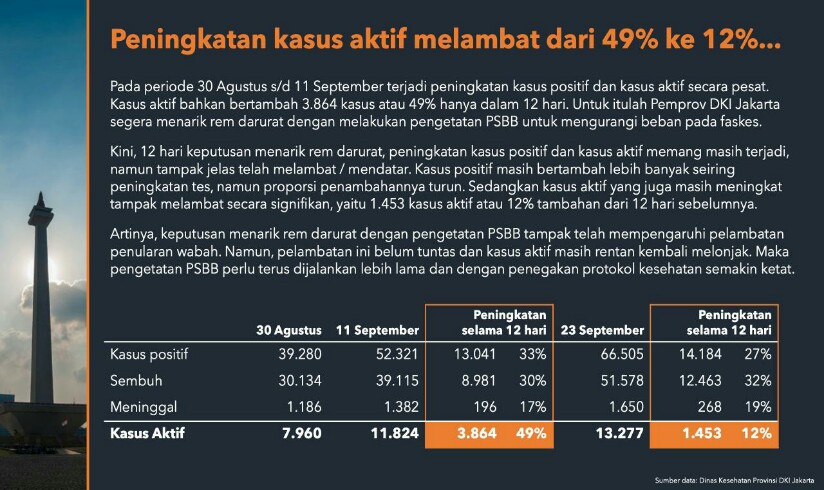 Pada 12 hari pertama bulan September, pertambahan kasus aktif sebanyak 49% atau 3.864 kasus. Pada periode PSBB, yakni 12 hari berikutnya, penambahan jumlah kasus aktif masih terjadi, namun berkurang menjadi 12% atau 1.453 kasus.