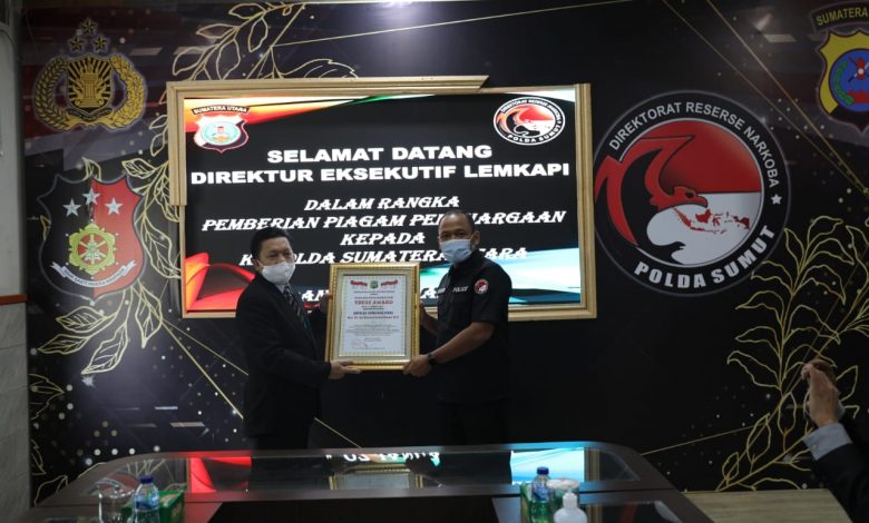 Piagam penghargaan Trust Award dari LEMKAPI kepada Kapolda Sumut ini diberikan terkait penanganan kasus tindak pidana Narkotika yang dilakukan Polda Sumut dan jajaran sangat bagus dan berdasarkan hasil survei mencapai 82,6 %.