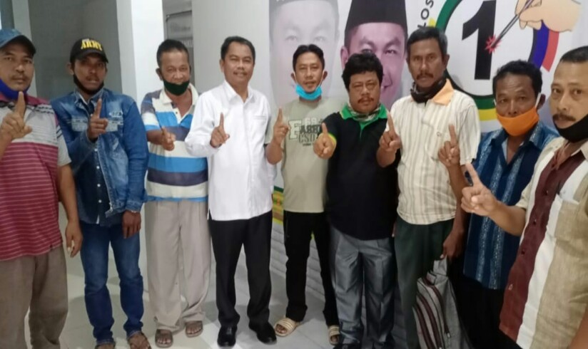 TEKS FOTO : Calon Bupati Sergai H Darma Wijaya berfoto bersama dengan Robert Tambun ketua IP3A wilayah Kecamatan Sei Rampah dan Sei Bamban, Surbakti ketua P34 Sukadamai sampai jalur Sei Belutu serta masyarakat petani di Sekretariat Bersama Rumah Dambaan di Sei Rampah, Sabtu (10/10/2020).