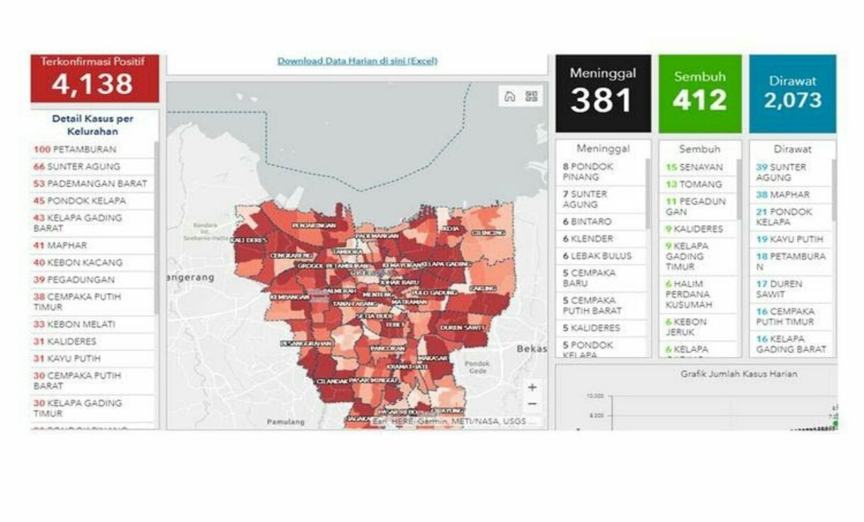 Adapun jumlah kumulatif kasus Konfirmasi di wilayah DKI Jakarta pada hari ini sebanyak 19.474 kasus. Dari jumlah tersebut, 11.997 orang dinyatakan telah sembuh, sedangkan 782 orang meninggal dunia.