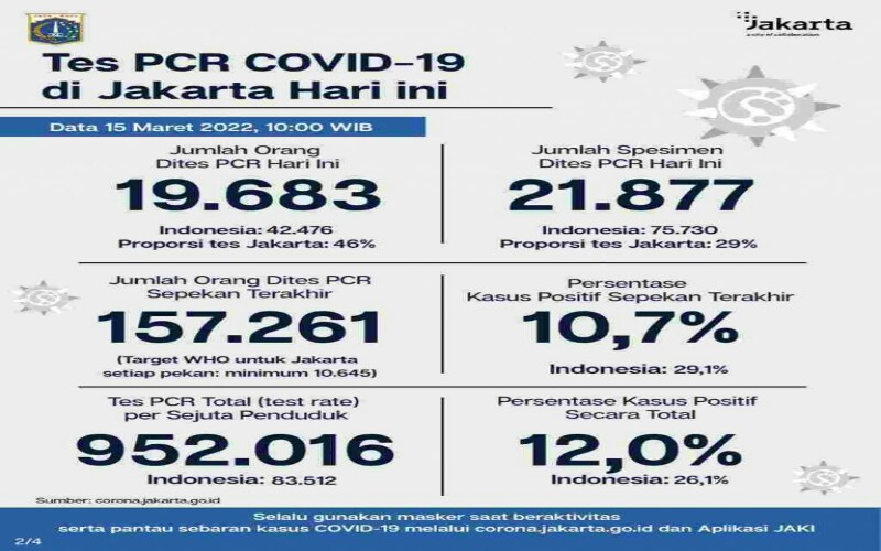 “Kami turut mengimbau agar masyarakat juga mewaspadai penularan Varian Omicron yang kini juga meningkat di Jakarta. Upaya 3T terus digalakkan, selain vaksinasi COVID-19 yang juga masih berlangsung dengan cakupan yang lebih luas,” ungkapnya, Selasa (15/03/2022).