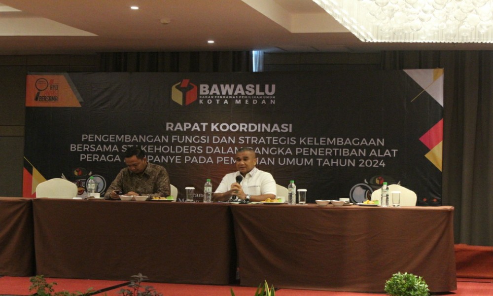 Hal ini disampaikan Wali Kota Medan, Bobby Nasution diwakili Asisten Pemerintah dan Sosial Muhammad Sofyan ketika menghadiri rapat koordinasi bersama stakeholder dalam rangka penertiban Alat Peraga Kampanye (APK) pemilu 2024 yang digelar Bawaslu Kota Medan di Hotel Grand City Hall, Kamis (8/2/2024).
